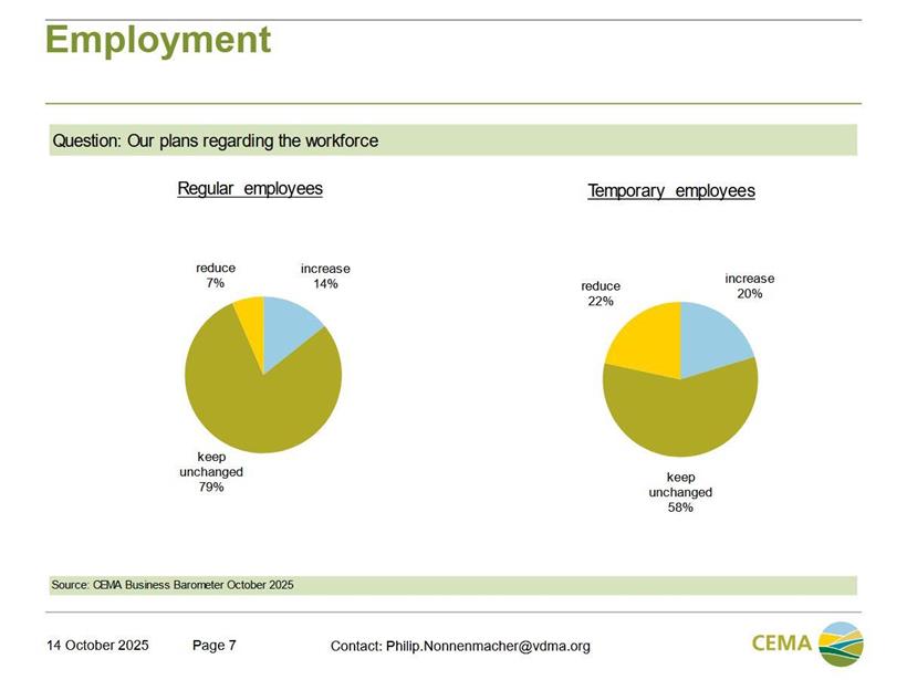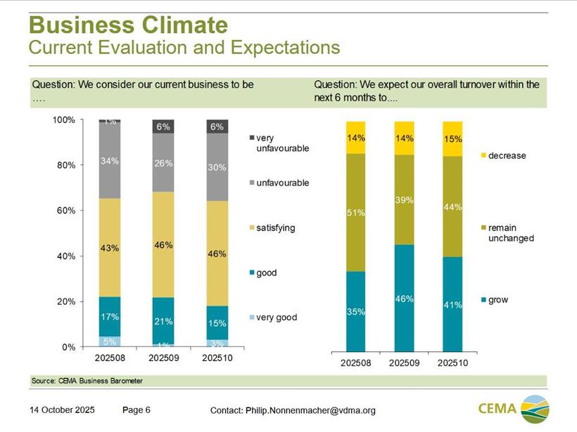 Η CEMA (European Agricultural Machinery Association) συντάσσει κάθε μήνα το Business Barometer, βασισμένο σε απαντήσεις 140 διευθυνόντων συμβούλων από εννέα ευρωπαϊκές χώρες. Η έρευνα αποτυπώνει όχι μόνο την τρέχουσα επιχειρηματική κατάσταση, αλλά και τις προσδοκίες πωλήσεων για τους επόμενους έξι μήνες, προσφέροντας μια αξιόπιστη εικόνα για τον παλμό της αγοράς γεωργικού εξοπλισμού στην Ευρώπη.