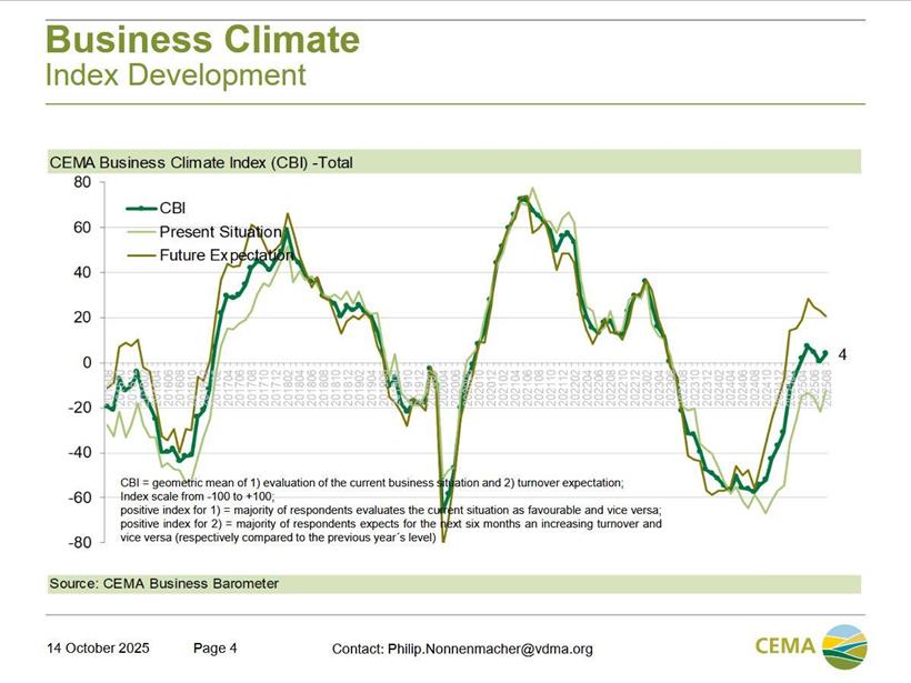 Μετά από έναν χρόνο διακυμάνσεων, ο δείκτης επιχειρηματικού κλίματος της CEMA υποχωρεί εκ νέου στις +4 μονάδες, αντικατοπτρίζοντας την προσεκτική αισιοδοξία και τις έντονες περιφερειακές ανισορροπίες στην αγορά γεωργικού εξοπλισμού της Ευρώπης.