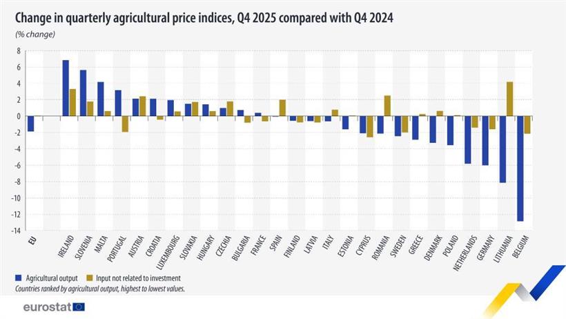 Μείωση κατά 1,9% κατέγραψαν οι μέσες τιμές αγροτικής παραγωγής στην Ευρωπαϊκή Ένωση το τέταρτο τρίμηνο του 2025, σε σύγκριση με την αντίστοιχη περίοδο του 2024, σύμφωνα με τα στοιχεία που δημοσίευσε η Eurostat. Η εξέλιξη αυτή έρχεται μετά από αυξήσεις που είχαν σημειωθεί στα τρία προηγούμενα τρίμηνα του ίδιου έτους.