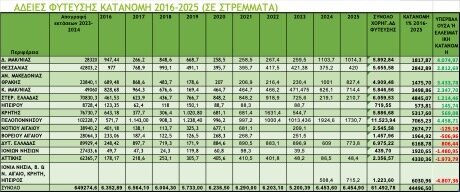 - Με τις ανωτέρω προϋποθέσεις, η απογραφείσα έκταση το 2024/25 στα 650.965 στρέμματα σε σύγκριση με το άθροισμα της έκτασης περιόδου 2015/16 (έναρξη του καθεστώτος Αδειών Φύτευσης) πλέον των χορηγηθεισών Αδειών Φύτευσης περιόδου 2016/17-2024/25 (627.734,4 στρ. + 55.037,88 στρ.= 650.965 στρ.), παρουσιάζει αρνητική διαφορά 31.807,28 στρεμμάτων, έκταση η οποία ερμηνεύεται ότι έχει εγκαταλειφθεί τα τελευταία εννέα χρόνια.