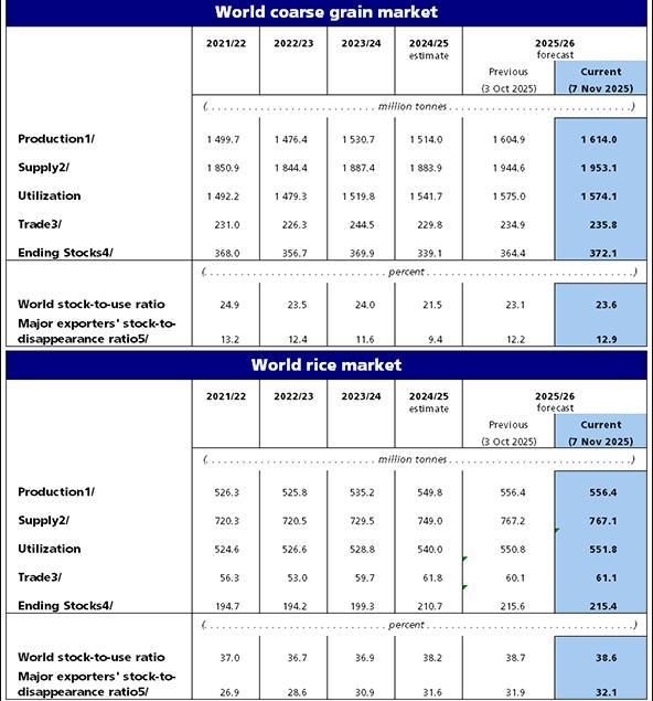 Με βάση τις τρέχουσες προβλέψεις, τα παγκόσμια αποθέματα δημητριακών το 2025 ενδέχεται να αυξηθούν κατά 5,7%, φτάνοντας σε νέο ρεκόρ 916,3 εκατομμυρίων τόνων. Τα αποθέματα καλαμποκιού αναμένεται να αυξηθούν περισσότερο, κυρίως στη Βόρεια Αμερική, ακολουθούμενα από το σιτάρι και το κριθάρι, ενώ τα αποθέματα σόργου ίσως παρουσιάσουν μικρή μείωση. Τα παγκόσμια αποθέματα ρυζιού στο τέλος της εμπορικής περιόδου 2025/26 εκτιμάται ότι θα αυξηθούν κατά 2,2%, φτάνοντας στο ιστορικό υψηλό των 215,4 εκατομμυρίων τόνων. Ο παγκόσμιος δείκτης αποθεμάτων προς κατανάλωση αναμένεται να ανέλθει στο 31,1%, το υψηλότερο επίπεδο από το 2017/18.