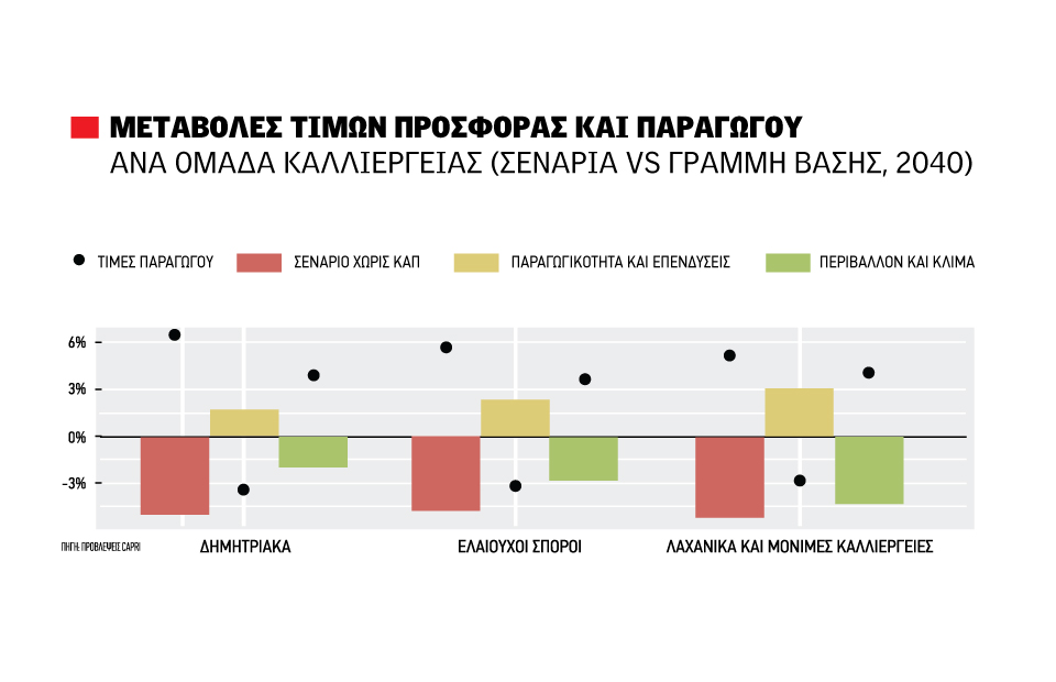Μάλιστα, στο προσοµοιωτικό σενάριο «Χωρίς ΚΑΠ», η έρευνα (µελέτη Scenar 2040)  δείχνει ότι το γεωργικό εισόδηµα θα µειωνόταν κατά περίπου 11%, µε τις µικρότερες και πιο ευάλωτες εκµεταλλεύσεις να αντιµετωπίζουν απώλειες έως και 21%. Η συνολική παραγωγή τροφίµων στην ΕΕ θα µειωνόταν κατά 5%, µειώνοντας την ικανότητα της ΕΕ να καλύψει τόσο την εγχώρια όσο και την παγκόσµια ζήτηση. Οι τιµές καταναλωτή των τροφίµων θα αυξάνονταν, πλήττοντας δυσανάλογα τις δαπάνες τροφίµων στα πιο ευάλωτα νοικοκυριά στην ΕΕ, ενώ η απασχόληση στον αγροδιατροφικό τοµέα θα µειωνόταν κατά περίπου 250.000 εργαζόµενους.