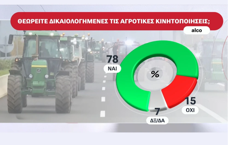 Πολύ σημαντικά ευρήματα προέκυψαν από την δημοσκόπηση της Alco για λογαριασμό του Alpha, καθώς το 78% των ερωτηθέντων θεωρεί δικαιολογημένες τις κινητοποήσεις των αγροτών.