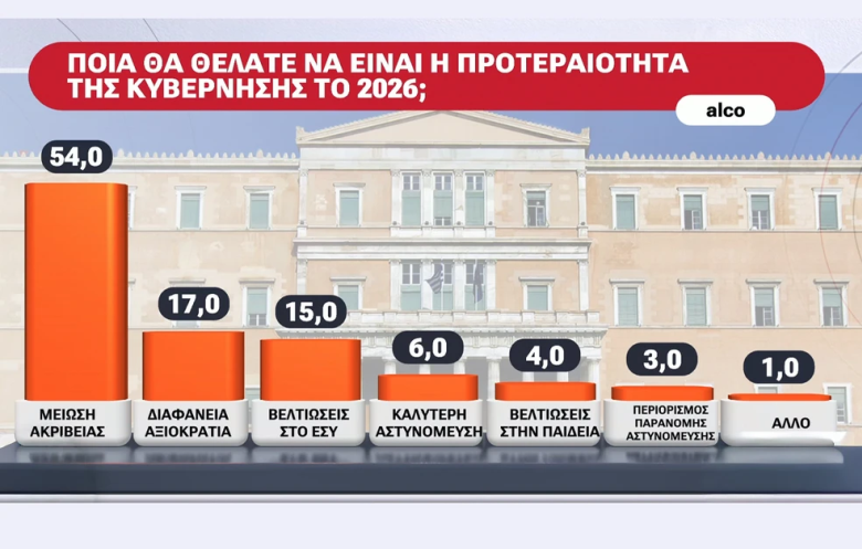 Στην έρευνα τέθηκαν και άλλα ερωτήματα, όπως τι περιμένουν οι πολίτες απο την κυβέρνηση το 2026, με το 54% να ζητά καταπολέμηση της ακρίβειας με την διαφάνεια και την αξιοκρατία να ακολουθούν.