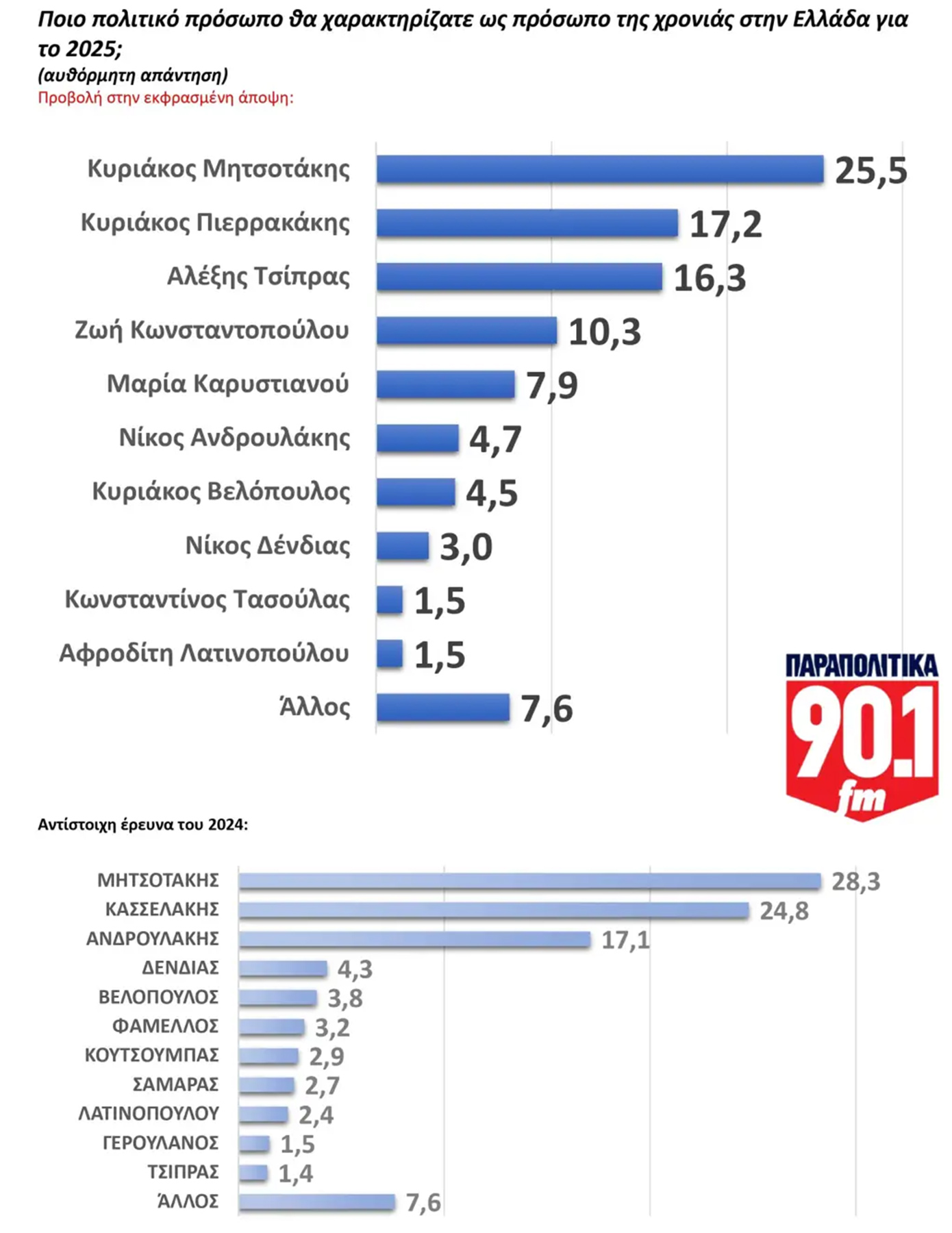 Στην κορυφή της κατάταξης των πολιτικών προσώπων αναδεικνύεται για δεύτερη συνεχόμενη χρονιά ο πρωθυπουργός Κυριάκος Μητσοτάκης, συγκεντρώνοντας ποσοστό 25,5%. Ακολουθούν ο Κυριάκος Πιερρακάκης με 17,2%, ο Αλέξης Τσίπρας με 16,3%, η Ζωή Κωνσταντοπούλου με 10,3%, ενώ την πρώτη πεντάδα συμπληρώνει η Μαρία Καρυστιανού με 7,9%.