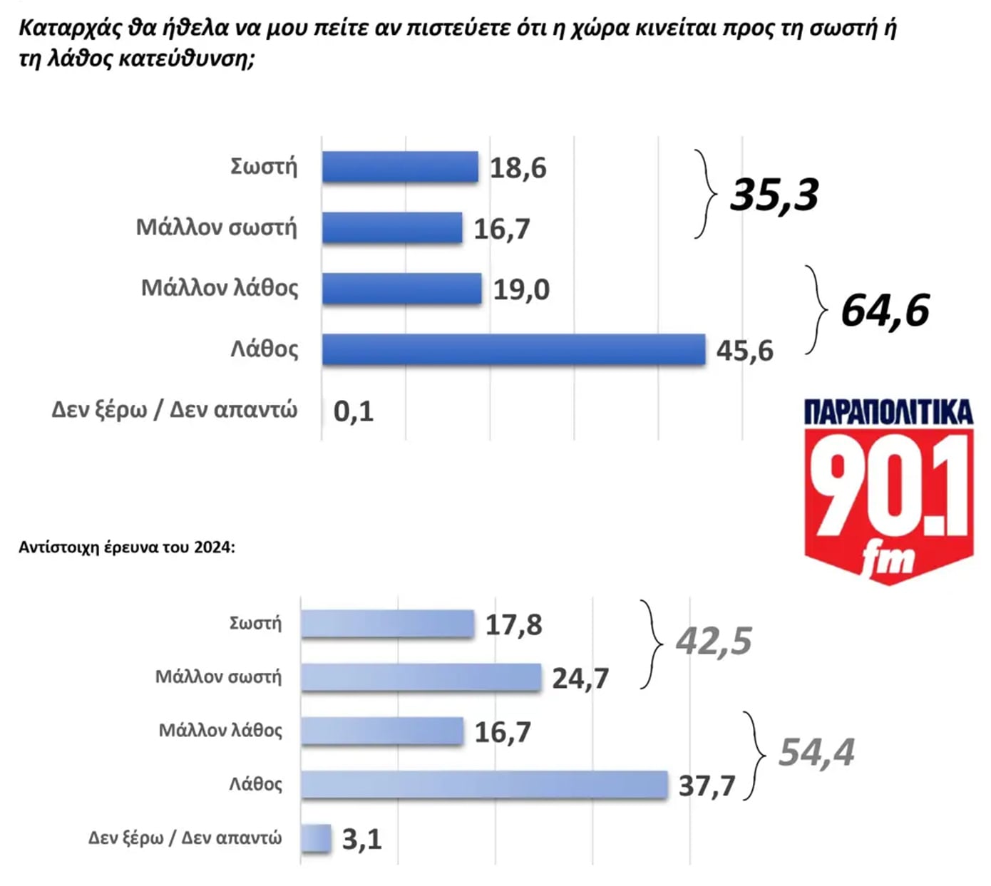 Ο πρώτος δείκτης αφορά τη συνολική πορεία της χώρας, με το 35,3% να δηλώνει ότι αυτή κινείται προς τη σωστή κατεύθυνση, ποσοστό μειωμένο κατά επτά περίπου ποσοστιαίες μονάδες σε σχέση με την αντίστοιχη απάντηση του 2024, με το ποσοστό όσων απαντούν ότι η χώρα κινείται προς τη λάθος κατεύθυνση να αυξάνεται από το 54,4% του 2024 στο 64,6% σήμερα.
