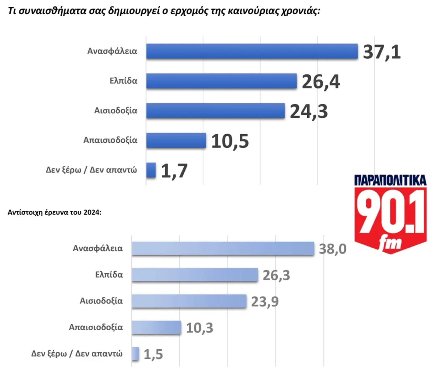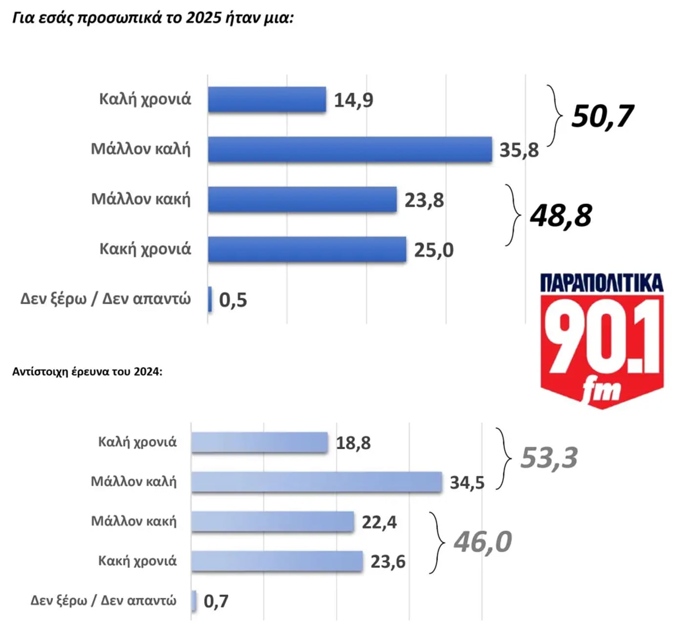 Αντίστοιχη μείωση σε σχέση με την περσινή χρονιά καταγράφεται και στο ποσοστό όσων δηλώνουν ότι το 2025 ήταν μία καλή χρονιά για τη χώρα συνολικά, με 35,2% έναντι 41,7% του 2024.