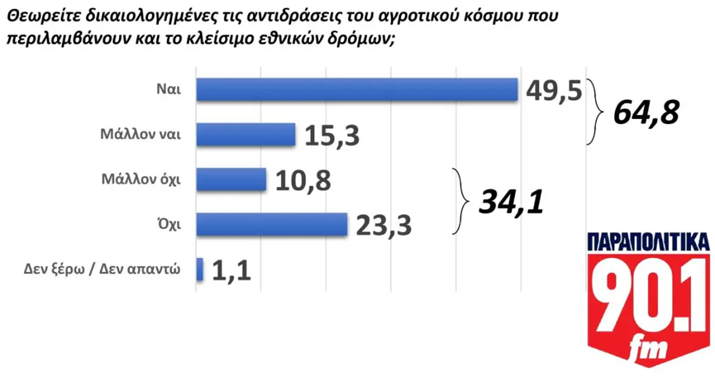 Στο κορυφαίο ζήτημα των τελευταίων ημερών, αυτό των αγροτικών κινητοποιήσεων, ένα πολύ σημαντικό ποσοστό της τάξης του 85,1% θεωρεί δίκαια τα αιτήματα του αγροτικού κόσμου. Ίσως, όμως, πιο σημαντικό εύρημα είναι το 64,8% που δικαιολογεί τη μορφή των κινητοποιήσεων, που περιλαμβάνουν και το κλείσιμο των εθνικών οδών.
