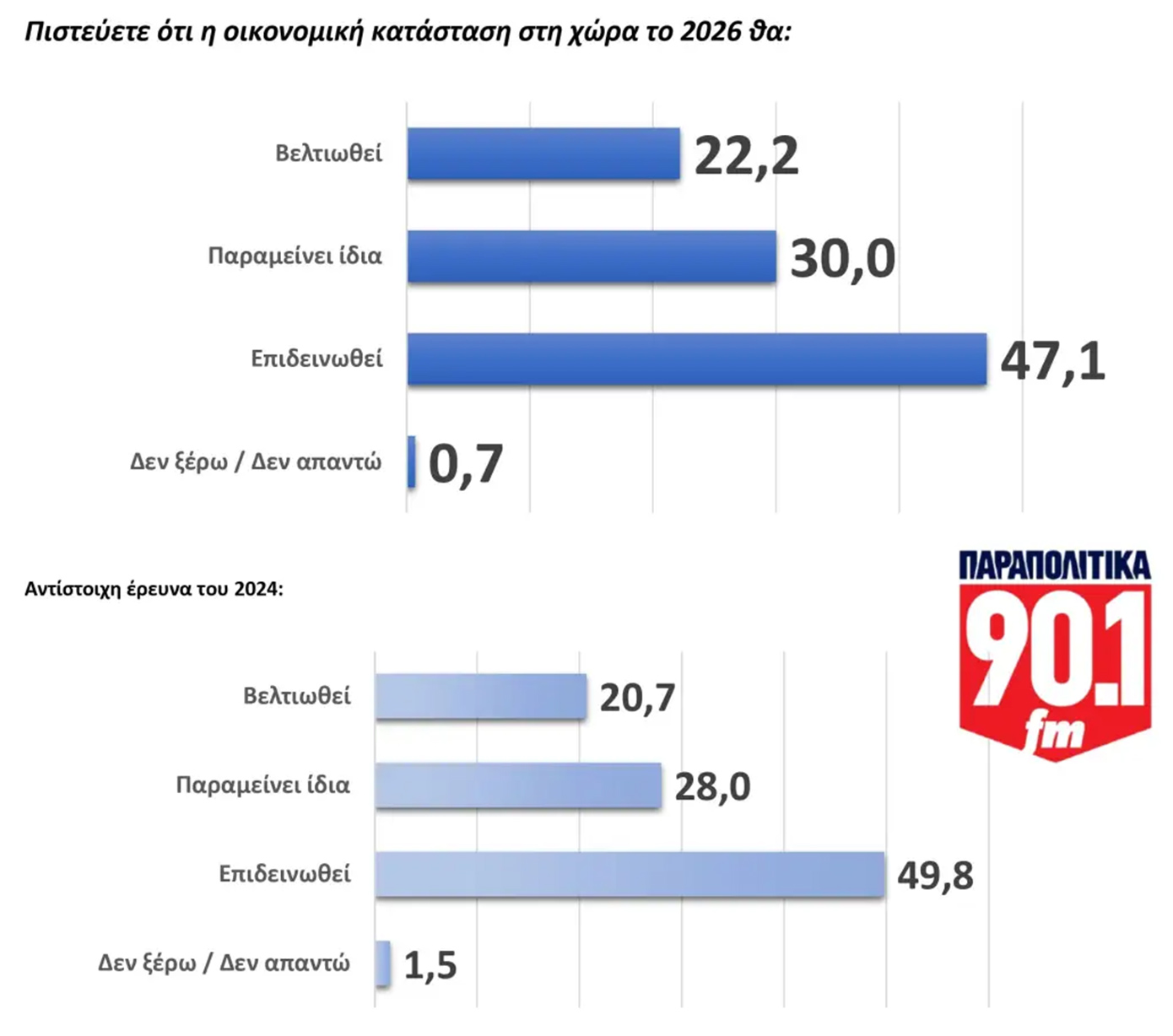 Ως προς την οικονομική κατάσταση της χώρας το 22,2% περιμένει βελτίωση του οικονομικού κλίματος, το 30% στασιμότητα και το 47,1% επιδείνωση.