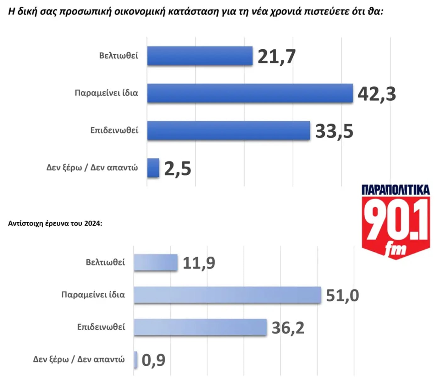 Σε προσωπικό επίπεδο το 21,7% περιμένει βελτίωση των οικονομικών του, το 42,3% σταθερότητα και το 33,5% επιδείνωση.