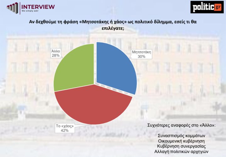 Στο καθιερωμένο πολιτικό δίλημμα «Μητσοτάκης ή χάος», το 42% των ερωτηθέντων απαντά «το χάος», ενώ το 30% επιλέγει τον Κυριάκο Μητσοτάκη και ένα 28% δηλώνει «Άλλο», με συχνές αναφορές σε συνασπισμούς κομμάτων, οικουμενική κυβέρνηση ή αλλαγή πολιτικών αρχηγών. Η υψηλή επιλογή της κατηγορίας «Άλλο» δείχνει ότι η επίκληση του φόβου ή της ανασφάλειας δεν πείθει πλέον την πλειονότητα, καθώς ένα σημαντικό τμήμα των πολιτών αναζητά πιο μετριοπαθείς και διαφορετικές μορφές πολιτικής εκπροσώπησης.