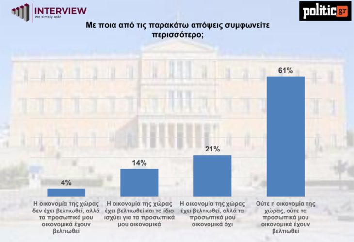 Η οικονομική κατάσταση παραμένει σημαντικό ζήτημα για τους πολίτες, με το 61% να δηλώνει ότι ούτε η οικονομία της χώρας ούτε τα προσωπικά του οικονομικά έχουν βελτιωθεί, ενώ το 21% θεωρεί ότι η οικονομία της χώρας έχει βελτιωθεί, αλλά όχι η προσωπική του κατάσταση. Μόλις το 14% πιστεύει ότι και η οικονομία της χώρας και τα προσωπικά του οικονομικά έχουν βελτιωθεί, ενώ ένα 4% αναφέρει βελτίωση μόνο στα προσωπικά του οικονομικά.