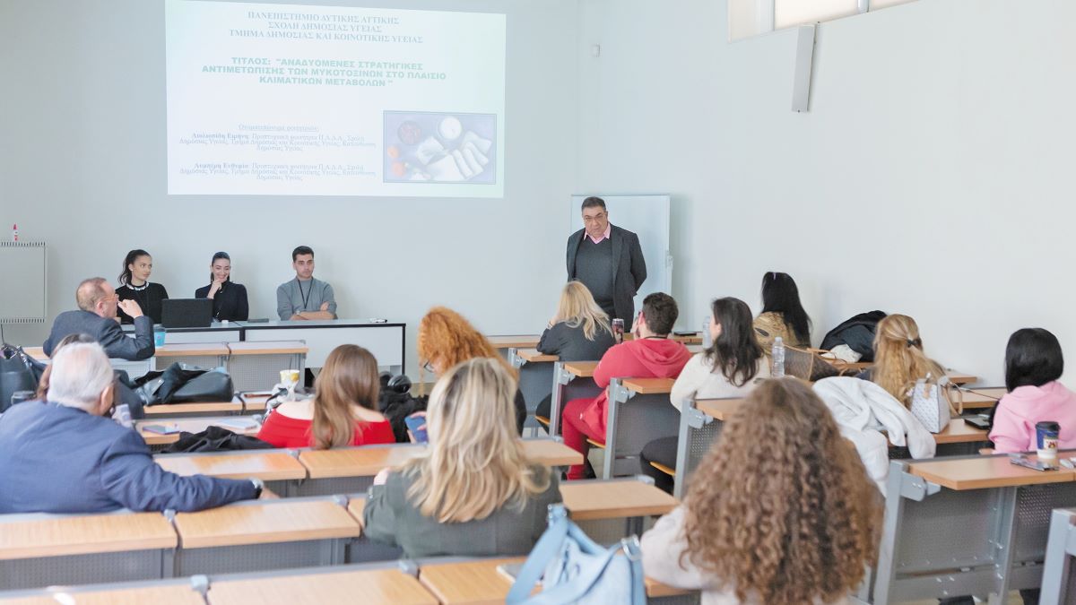 Μία πρωτότυπη πρωτοβουλία των φοιτητών του Τμήματος Δημόσιας και Κοινοτικής Υγείας του Πανεπιστημίου Δυτικής Αττικής (ΠΑΔΑ) πραγματοποιήθηκε την Τετάρτη 17 Δεκεμβρίου 2025 στην Πανεπιστημιούπολη 3, με τη διοργάνωση της ημερίδας «Κλιματική Αλλαγή, Ασφάλεια Τροφίμων και Δημόσια Υγεία». Το ιδιαίτερο χαρακτηριστικό της εκδήλωσης ήταν ότι οι ίδιοι οι φοιτητές ανέλαβαν τον ρόλο των εισηγητών, δίνοντας έμφαση στην ενημέρωση της κοινωνίας και προβάλλοντας τη δυναμική της εκπαίδευσης του ΠΑΔΑ.