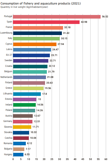 Η έκθεση εξετάζει επίσης τα δεδομένα των καταναλωτών, τα οποία δείχνουν ότι η μέση κατανάλωση ψαριών ή θαλασσινών στην ΕΕ είναι 23,7 κιλά ετησίως, περίπου 3 κιλά πάνω από τον παγκόσμιο μέσο όρο. Η κατανάλωση, ωστόσο, ποικίλλει σημαντικά στην ΕΕ, από 6,6 κιλά ανά άτομο ετησίως στην Ουγγαρία έως 56,5 κιλά στην Πορτογαλία. Τα τρία τέταρτα των ψαριών ή θαλασσινών που καταναλώνονται στην ΕΕ προέρχονται από την άγρια αλιεία, ενώ το υπόλοιπο τέταρτο προέρχεται από την υδατοκαλλιέργεια.