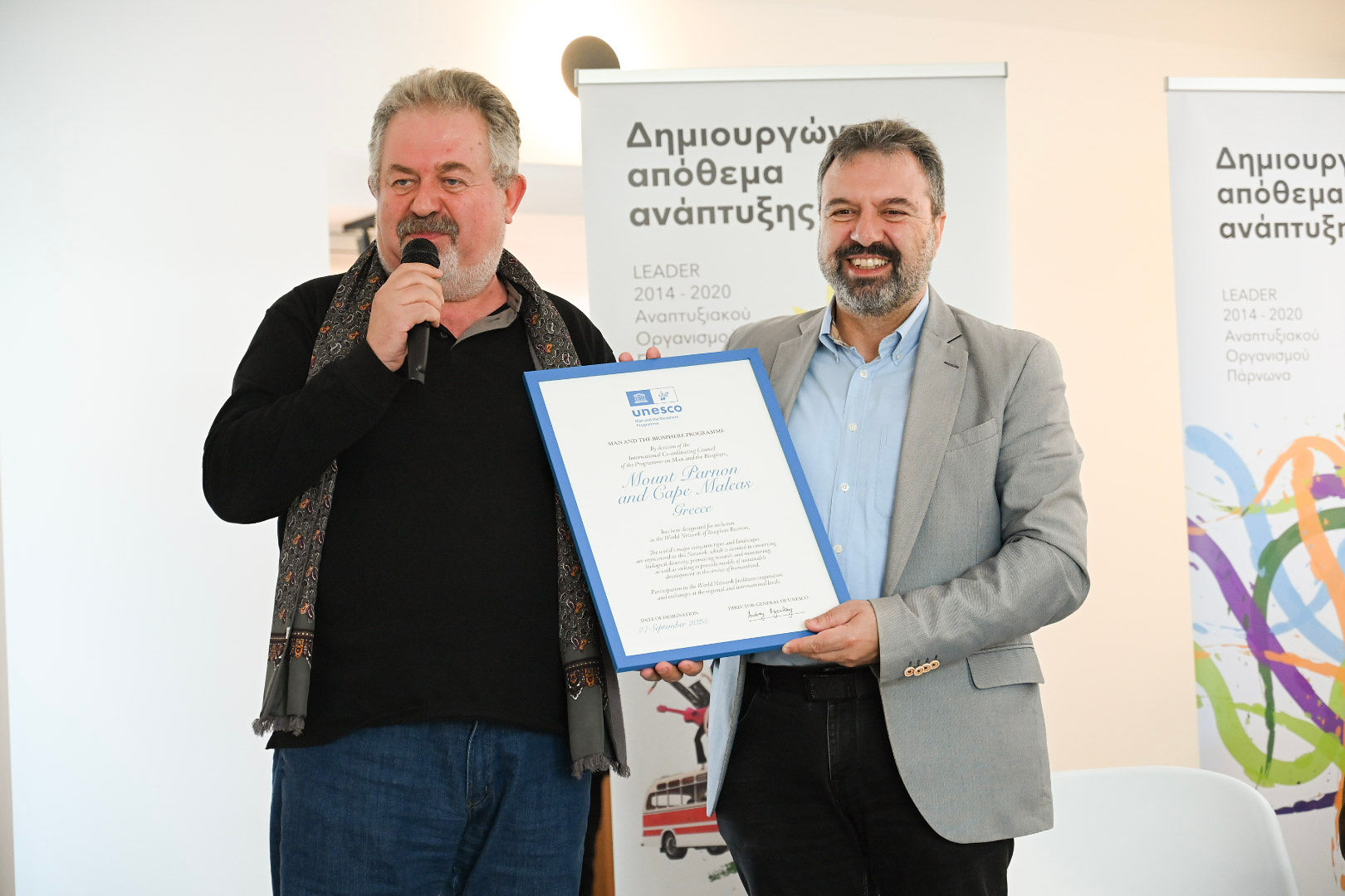 Στο τέλος της ημέρας παραδόθηκε στον πρόεδρο του Επιμελητηρίου Λακωνίας, Ιωάννη Παναρίτη η διακήρυξη της περιοχής Όρος Πάρνωνα-Ακρωτήριο Μαλέα ως απόθεμα βιόσφαιρας από την UNESCO.