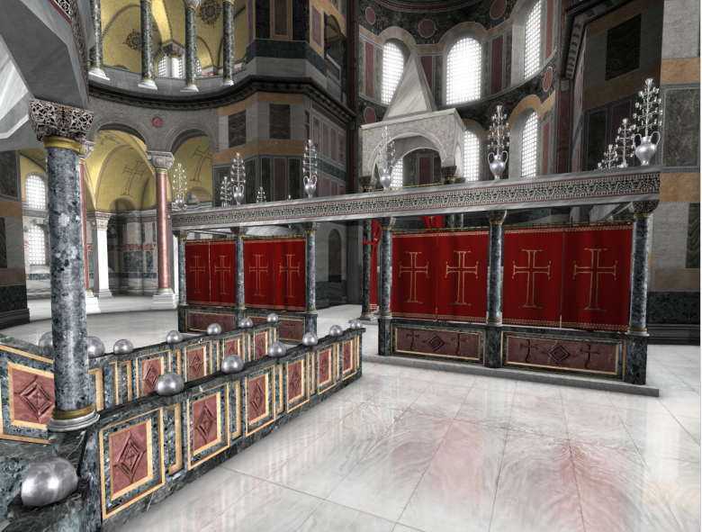 «Το ιερό… Ο χώρος αυτός είναι εντελώς απρόσιτος στους άλλους εξόν των ιερέων. Τον ονομάζουν και θυσιαστήριο. Είναι καλυμμένος με σαράντα χιλιάδες λίτρα ασήμι!» γράφει ο Προκόπιος προσπαθώντας να αποδώσει μία εικόνα, που δεν χωράει στα μάτια του… «Θα νόμιζε κανείς ότι έχει βρεθεί σε πανέμορφο ολάνθιστο κήπο […] θα μπορούσε να θαυμάσει κανείς το χρώμα της πορφύρας… της χλόης… το βαθύ κόκκινο που απλώνεται στις επιφάνειες ή και το λευκό που αστράφτει περισσότερο… Όταν κάποιος έρχεται στο ιερό για να προσευχηθεί, συνειδητοποιεί αμέσως ότι το έργο τούτο δεν έγινε τόσο τέλειο ούτε από τη δύναμη, ούτε από την τέχνη των ανθρώπων, αλλά από θεϊκή επενέργεια· ο νους του μετουσιώνεται και κατευθύνεται προς τον Θεό και νομίζει ότι ο Θεός δεν είναι μακριά, αλλά ότι έχει τρυπώσει χωρίς να γίνη αντιληπτός ανάμεσα σ΄ εκείνους που διάλεξε».