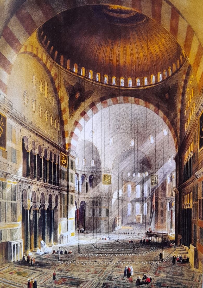 Η Μεγάλη Εκκλησία, η Αγία Σοφία, μετατρέπεται σε τζαμί. Θηριώδη ταμπλό με προσευχές από το κοράνι αναρτώνται εσωτερικά στις τέσσερις γωνίες της, κάτω από τα σφαιρικά τρίγωνα, που απορροφούν το βάρος του τρούλου. Η πρόσβαση στον ναό είναι ελεύθερη μόνον για τους Οθωμανούς, που εισέρχονται ανυπόδητοι για να υμνήσουν τον Αλλάχ. Το κάλεσμα σε προσευχή από τον μιναρέ, που προστίθεται στο νοτιοδυτικό εξωτερικό άκρο του ναού, αντηχεί σε όλη την πόλη. Τον 16ο αι. ο Οθωμανός αρχιτέκτονας Σινάν αντικαθιστά αυτόν τον αρχικό μιναρέ με νέο και προσθέτει άλλους τρεις στα υπόλοιπα άκρα του κτηρίου.