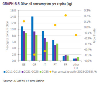- Η κατά κεφαλήν κατανάλωση ελαιολάδου προβλέπεται ότι θα μειώνεται κατά 0,6% ετησίως έως το 2035