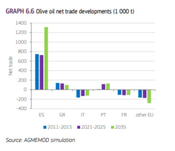 Αυτά τα στοιχεία συνδέονται και με την έκθεση της Ευρωπαϊκής Επιτροπής «Γεωργικές προοπτικές της ΕΕ για την περίοδο 2025-2035» που αφορά το ελαιόλαδο και τις επιτραπέζιες ελιές. Το μέλλον του τομέα του ελαιολάδου στην Ευρωπαϊκή Ένωση αναμένεται να επηρεαστεί σημαντικά από μια αλλαγή που ήδη παρατηρείται στην Πορτογαλία και στην Ισπανία, σύμφωνα με την οποία τα επόμενα χρόνια, οι παραδοσιακοί ξηρικοί ελαιώνες προβλέπεται να αντικατασταθούν σταδιακά από υπερεντατικά συστήματα ελαιοκαλλιέργειας με αποτελεσματική διαχείριση του νερού. Η μετάβαση αυτή θεωρείται καθοριστική για τη διατήρηση της οικονομικής βιωσιμότητας του κλάδου.