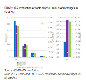 Όσον αφορά της επιτραπέζιες ελιές, οι Ισπανοί παραγωγοί υστερούν στην ανταγωνιστικότητα και στο διεθνές μερίδιο αγοράς, ενώ τα επόμενα χρόνια, οι μη αρδευόμενοι ελαιώνες που δεν αποφέρουν κέρδη ενδέχεται να οδηγηθούν σε εγκατάλειψη. Σύμφωνα με τις προβλέψεις, η παραγωγή αναμένεται να σημειώσει ετήσια μείωση κατά 0,2% έως το 2035. Η εξέλιξη αυτή συνδέεται κυρίως με τη συρρίκνωση των καλλιεργούμενων εκτάσεων κατά περίπου 0,7% τον χρόνο, η οποία αντισταθμίζεται εν μέρει από τη βελτίωση των αποδόσεων μέσω αρδευόμενων καλλιεργητικών πρακτικών. Με βάση τις τρέχουσες εκτιμήσεις, η αύξηση αυτών των αποδόσεων θα μπορούσε να ενισχύσει την παραγωγή της Ισπανίας κατά 0,6% ετησίως. Τέλος, η κατά κεφαλήν κατανάλωση επιτραπέζιων ελιών στην Ισπανία αναμένεται να μειωθεί, λόγω της αύξησης των τιμών και της πληθυσμιακής μείωσης.Παρακάτω φαίνονται τα αντίστοιχα διαγράμματα: