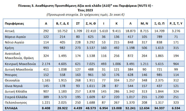 Τα επίσημα στατιστικά στοιχεία της ΕΛΣΤΑΤ για το 2023, αποτυπώνουν την περιθωριοποίηση του πρωτογενούς τομέα και των Περιφερειών με ισχυρή αγροτική βάση ενώ παράλληλα η συνολική Ακαθάριστη Προστιθέμενη Αξία (*) σε τρέχουσες τιμές αυξήθηκε κατά 7,3% σε σύγκριση με το 2022 φτάνοντας τα 196 δισ. ευρώ (Πίνακας 1).