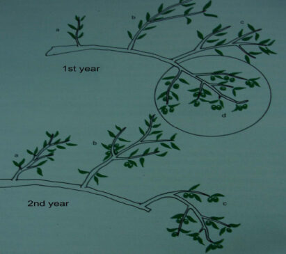 Σχηματική απεικόνιση κλαδέματος καρποφόρων κλαδιών ελιάς σε περίοδο δύο ετών.