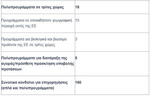 Έως 160 εκατ. ευρώ θα εκταμιευθούν σε επιχορηγήσεις για τη συγχρηματοδότηση προγραμμάτων από ομάδες παραγωγών και άλλους εμπορικούς φορείς του αγροδιατροφικού τομέα: 150 εκατ. ευρώ κατανέμονται μεταξύ της προώθησης σε τρίτες χώρες και της εσωτερικής αγοράς της ΕΕ, με κονδύλια ύψους 70,3 εκατ. ευρώ και 79,7 εκατ. ευρώ αντίστοιχα· 10 εκατ. ευρώ προορίζονται για μέτρα αντιμετώπισης κρίσεων.