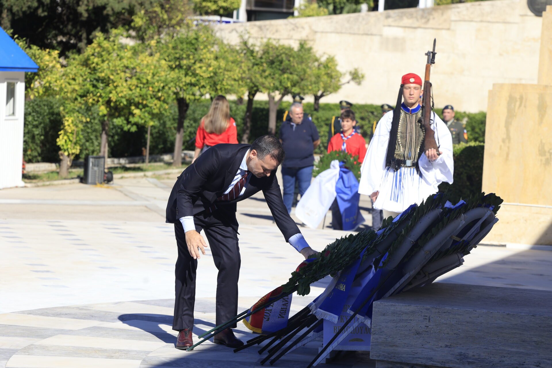 Πριν την μαθητική παρέλαση, η πολιτική και πολιτειακή ηγεσία κατευθύνθηκε στο μνημείο του «Αγνώστου Στρατιώτη» για να καταθέσει στεφάνια ως φόρο τιμής για την επέτειο του «ΟΧΙ».
