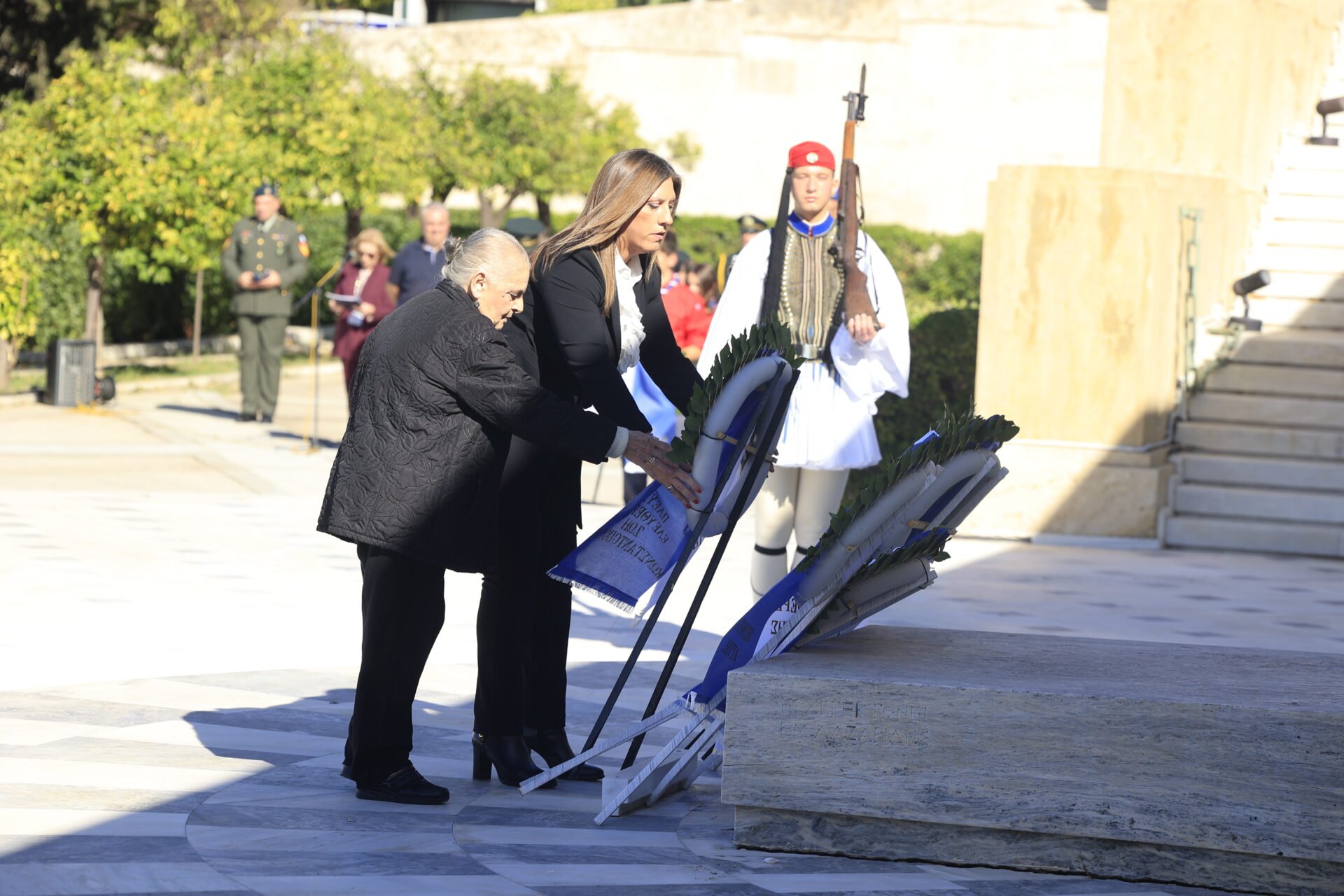 Στεφάνι κατέθεσε εκ μέρους της ελληνικής κυβέρνησης η υπουργός Παιδείας, Θρησκευμάτων και Αθλητισμού, Σοφία Ζαχαράκη και εκ μέρους της Πολιτειακής ηγεσίας της χώρας ο πρόεδρος της Βουλής, Νικήτας Κακλαμάνης.