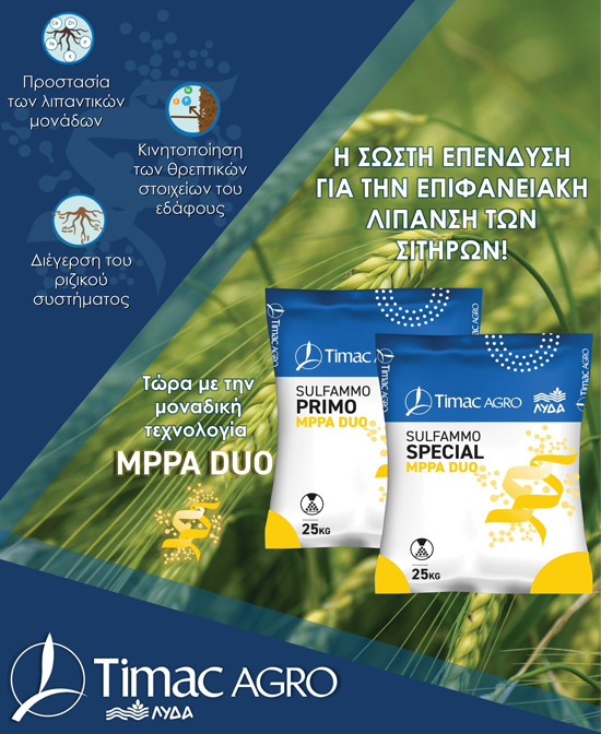 Η επίτευξη υψηλών ποσοστών πρωτεΐνης δεν είναι τυχαία, απαιτεί σωστό σχεδιασµό και παρεµβάσεις στον κατάλληλο χρόνο. Στο πλαίσιο αυτό, η TIMAC AGRO | ΛΥ∆Α εστιάζει σε λύσεις που στοχεύουν τόσο στη θρέψη όσο και στη βελτίωση των ποιοτικών χαρακτηριστικών των καλλιεργειών. Η τεχνολογία MPPA DUO, που ενσωµατώνεται στα αζωτούχα λιπάσµατα SULFAMMO, αποτελεί ένα καινοτόµο εργαλείο υποστήριξης της ανάπτυξης των φυτών, αποτέλεσµα µακροχρόνιας επιστηµονικής έρευνας της Timac Agro. Η δράση της συνδυάζει αποτελεσµατική θρέψη και βιοδιέγερση, περιορίζοντας τις απώλειες αζώτου. Η λειτουργικότητά της βασίζεται, αρχικά, στην προστασία και ελεγχόµενη παροχή βασικών θρεπτικών στοιχείων καθ’ όλη τη διάρκεια της καλλιεργητικής περιόδου, µέσω της πλήρης προστασίας όλων των λιπαντικών µονάδων, όπως το άζωτο, το θείο, το µαγνήσιο και τα ιχνοστοιχεία, µειώνοντας έτσι σηµαντικά τις απώλειες από εξαέρωση, έκπλυση ή δέσµευση στο έδαφος, ενώ τα στοιχεία καθίστανται διαθέσιµα στο φυτό σύµφωνα µε τις πραγµατικές ανάγκες του ίδιου. Παράλληλα, η τεχνολογία MPPA DUO συµβάλλει στην αποδέσµευση και στην καλύτερη αξιοποίηση των θρεπτικών στοιχείων που ήδη υπάρχουν στο έδαφος από προηγούµενες λιπάνσεις. Με τον τρόπο αυτό, αυξάνεται η διαθεσιµότητα στοιχείων όπως ο φώσφορος και το κάλιο, καθώς και των ιχνοστοιχείων, ενισχύοντας τη συνολική θρεπτική επάρκεια της καλλιέργειας. Ιδιαίτερη σηµασία δίνεται και στη διέγερση του ριζικού συστήµατος. Μέσω του φυτικής προέλευσης βιοδιεγέρτη XCK, προάγεται η ανάπτυξη ισχυρών ριζών, βελτιώνεται η εδαφική εξερεύνηση και ενισχύεται η αποτελεσµατική απορρόφηση των θρεπτικών στοιχείων, ακόµη και σε προχωρηµένα στάδια ανάπτυξης.