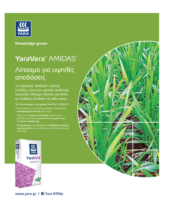 Στη δεύτερη δόση της επιφανειακής λίπανσης προτείνουµε να εφαρµοστεί το YaraVera AMIDAS το οποίο θα παράσχει στην καλλιέργεια τις υπόλοιπες µονάδες αζώτου µέχρι τη συγκοµιδή.