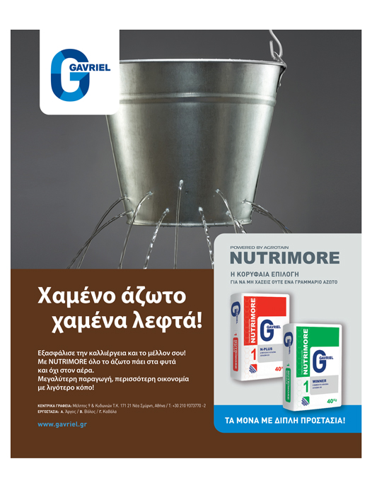 Για τον λόγο αυτό, η GAVRIEL, µε γνώµονα τη βιωσιµότητα του Έλληνα παραγωγού, παράγει και προτείνει τα NUTRIMORE N-PLUS & NUTRIMORE WINNER. Αζωτούχα λιπάσµατα νέας τεχνολογίας που υπερέχουν ξεκάθαρα έναντι των ανταγωνιστικών προϊόντων, προσφέροντας µέγιστη αξιοποίηση του αζώτου, υψηλότερες αποδόσεις και χαµηλότερο κόστος ανά µονάδα θρέψης.