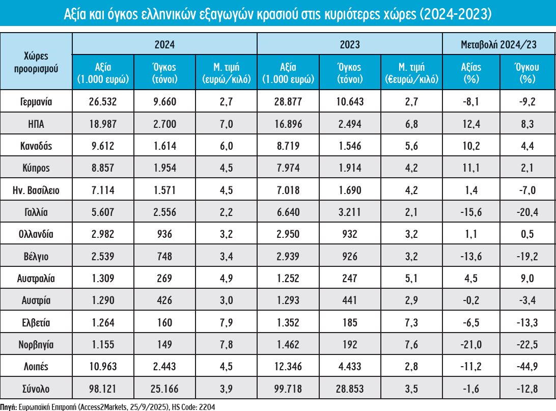 Ωστόσο, στο σύνολό του, ο όγκος των εξαγωγών κρασιού της ΕΕ μειώθηκε την περίοδο 2024/25 σε 28,4 εκατ. εκατόλιτρα, παρουσιάζοντας κάμψη ως προς την προηγούμενη (-1,5%), ενώ οριακή θεωρείται η μεταβολή ως προς την αξία, που εκτιμάται σε 16,6 δισ. ευρώ, παρά τη μικρή βελτίωση της μέσης τιμής εξαγωγής που ανήλθε σε 5,9 ευρώ/λίτρο.