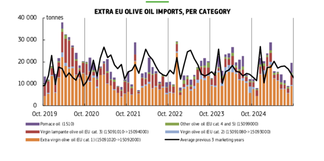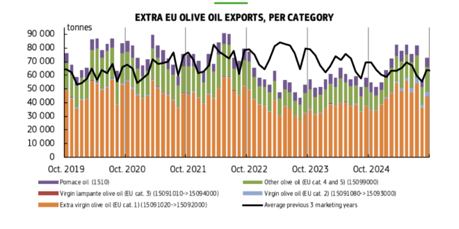 Τα διαγράμματα που αφορούν τις εισαγωγές και εξαγωγές εκτός ΕΕ δείχνουν ότι η ζήτηση για ελαιόλαδο από χώρες εκτός ΕΕ παραμένει ισχυρή, με τις εξαγωγές να καταγράφουν σταθερές αυξήσεις, ιδίως για το έξτρα παρθένο ελαιόλαδο. Αν και οι εξαγωγές και οι εισαγωγές έχουν τις δικές τους διακυμάνσεις, το συνολικό πρόσημο είναι θετικό, με τις τάσεις να δείχνουν ανθεκτικότητα και ανάπτυξη στη ζήτηση. Στην περίπτωση των εισαγωγών, οι αριθμοί φαίνεται να αυξάνονται σε περιόδους όπου η παγκόσμια ζήτηση είναι πιο έντονη, ενώ οι εξαγωγές δείχνουν ελαφρές αυξήσεις, καταδεικνύοντας την αντοχή του εξαγωγικού τομέα στην παγκόσμια αγορά.
