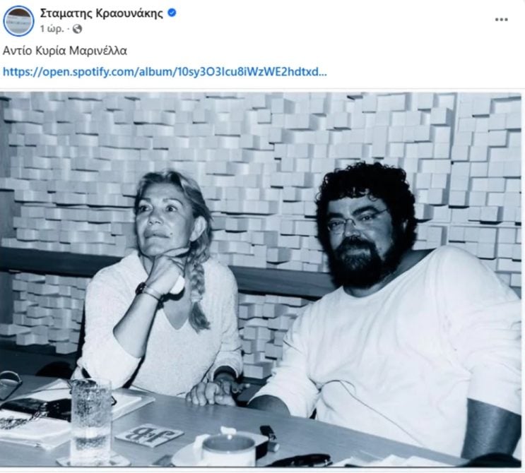 Ο Σταμάτης Κραουνάκης δημοσίευσε μια παλιά, κοινή τους φωτογραφία, συνοδεύοντάς την με τη φράση «Αντίο Κυρία Μαρινέλλα».