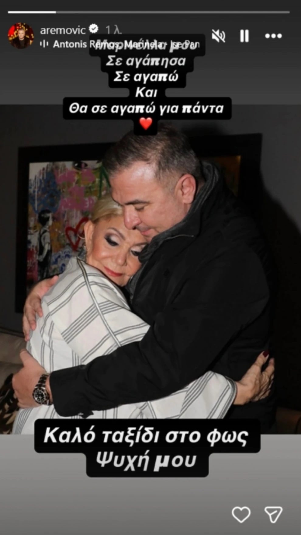 Ο Αντώνης Ρέμος, με τον οποίο τους συνέδεε χρόνια κοινής πορείας και αγάπης, δημοσίευσε μια φωτογραφία που τους δείχνει αγκαλιά. «Μαρινέλλα μου, σε αγάπησα, σε αγαπώ και θα σε αγαπώ για πάντα. Καλό ταξίδι στο φως ψυχή μου», έγραψε στο instastory του.