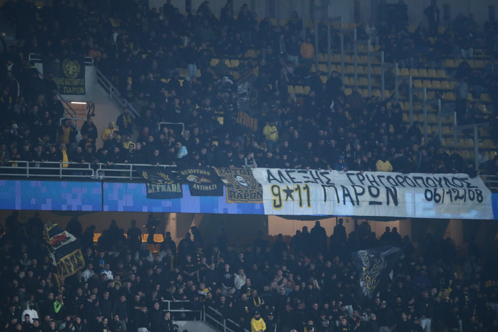 Όταν ο πόνος ενώνει. Οι οπαδοί της ΑΕΚ είχαν αναρτήσει μια πελώρια φωτογραφία του αδικοχαμένου Μάριου που πλήρωσε με τη ζωή του το τυφλό οπαδικό μένος στη Χαλκίδα, ίσως και τα δολοφονικά ένστικτα ανθρώπων που θέλουν να βρουν οπαδικές διαφορές για να τα εκδηλώσουν.