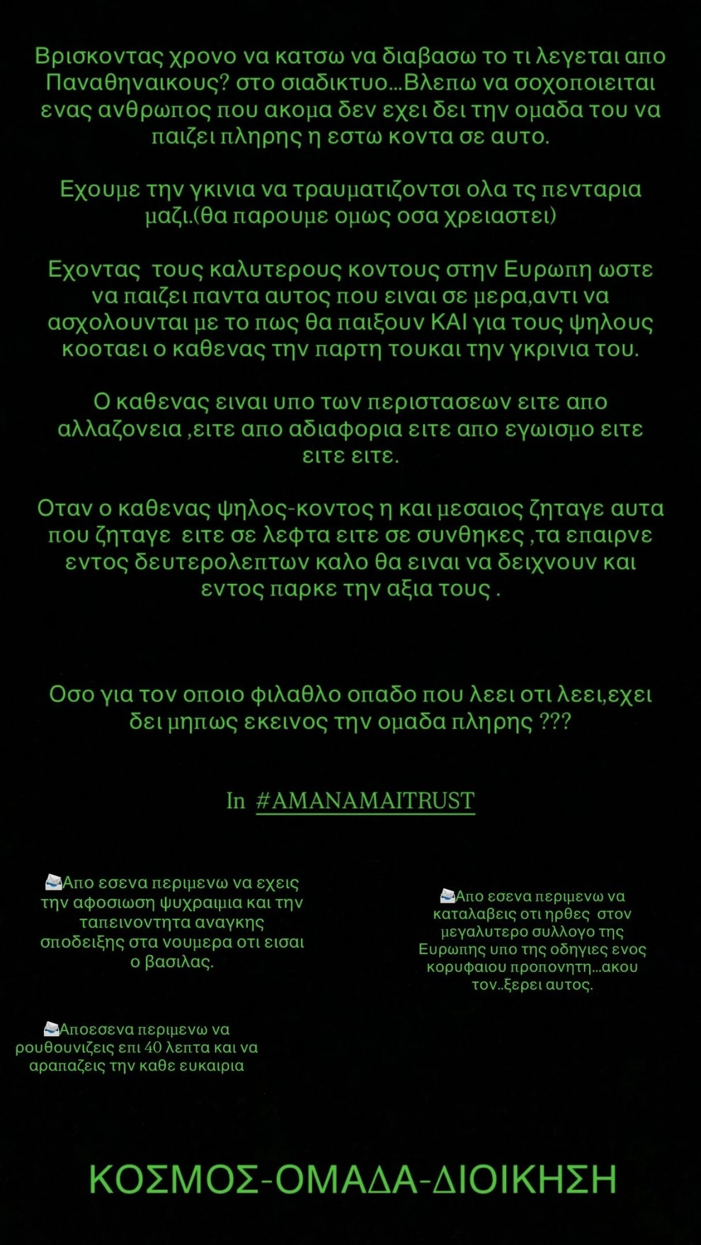 «Bρίσκοντας χρόνο να διαβάσω το τι λέγεται από Παναθηναϊκούς στο διαδίκτυο… Βλέπω να στοχοποιείται ένας άνθρωπος που ακόμα δεν έχει δει την ομάδα του να παίζει πλήρης ή έστω κοντά σε αυτό.