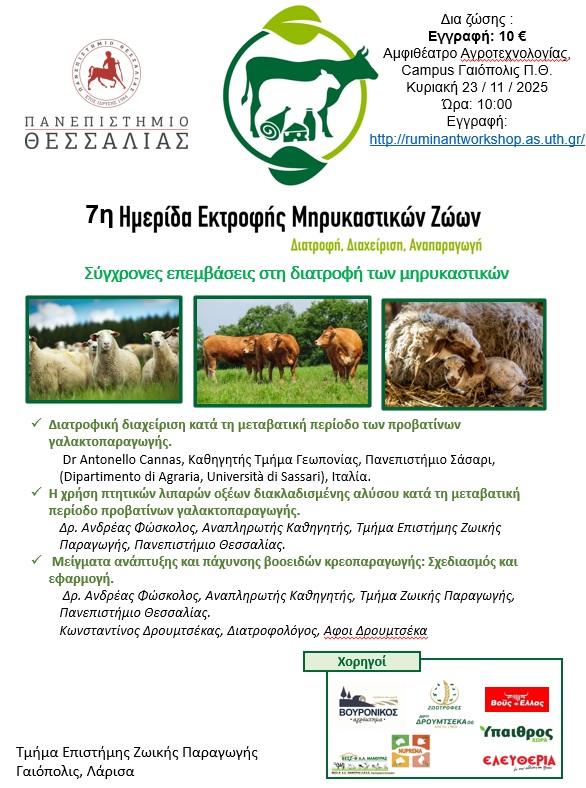 Το Εργαστήριο Ζωοτεχνίας-Εκτροφής Μηρυκαστικών Ζώων του Πανεπιστημίου Θεσσαλίας διοργανώνει την 7η Ημερίδα Εκτροφής Μηρυκαστικών Ζώων, με κεντρικό θέμα «Σύγχρονες επεμβάσεις στη διατροφή των μηρυκαστικών».