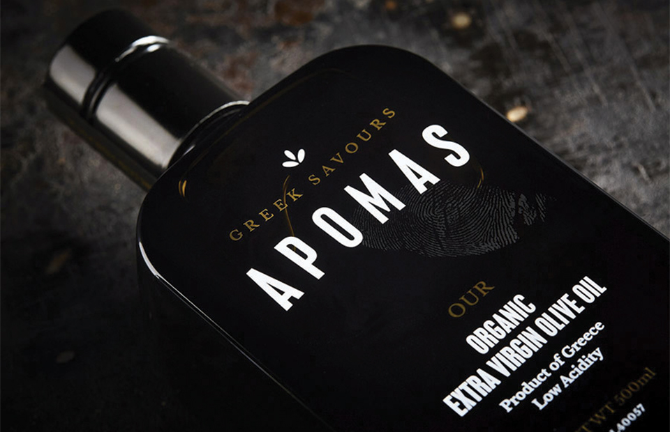APOMAS Organic EVOOΜε τεχνική µεταξοτυπίας στην ντιζαϊνάτη φιάλη