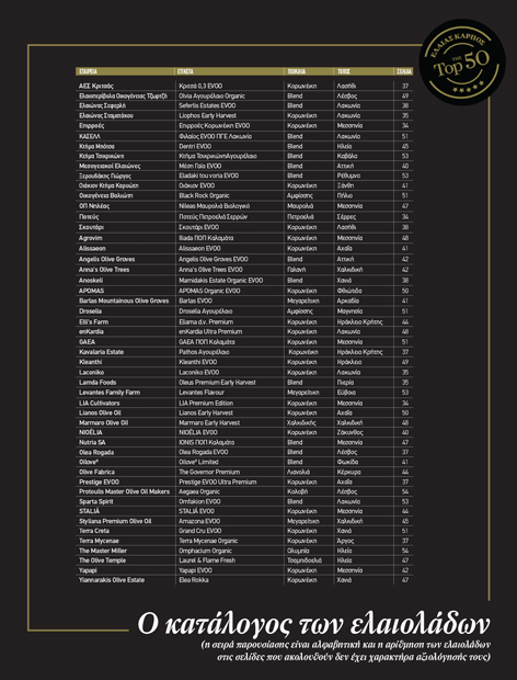 Δεν αρκούν τα πολλά μικρά σπίτια, που εδώ και κάποια χρόνια κρατούν ψηλά τη σημαία της αυθεντικότητας στην τυποποίηση του ελαιόλαδου και τα οποία η έκδοση The Top 50 του Ελαίας Καρπός έχει αγκαλιάσει από την πρώτη στιγμή. Είναι καιρός για μια γενναία επιλογή στήριξης των σημάτων ποιότητας που βασίζονται στην εγχώρια παραγωγή. Η συνεισφορά της Πολιτείας σ’ αυτή την προσπάθεια θα πρέπει να επικεντρωθεί τόσο στην ενίσχυση της τυποποίησης και των πρωτοβουλιών εξωστρέφειας, όσο και στον αυστηρό έλεγχο της διακίνησης του προϊόντος στην εσωτερική αγορά. Η ομάδα του Ελαίας Καρπός – The Top 50 είναι εδώ να αναδείξει με κάθε πρόσφορο μέσο τη συστηματική δουλειά των Ελλήνων παραγωγών και να καταγράψει τα καλά παραδείγματα που δοξάζουν τα χρώματα του ελληνικού ελαιολάδου.