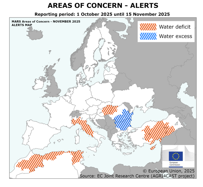 Οι ξηρές συνθήκες επιβραδύνουν τη σπορά στην κεντρική Ιταλία, την ανατολική Ουγγαρία και τη δυτική Ρουμανία. Οι υπερβολικές βροχοπτώσεις στη νότια Ρουμανία και τη βόρεια Βουλγαρία προκάλεσαν σημαντικές καθυστερήσεις. Εκτός της ΕΕ, η Τουρκία και το Μαγκρέμπ εξακολουθούν να αντιμετωπίζουν σοβαρά ελλείμματα βροχοπτώσεων, με αποτέλεσμα την μη βέλτιστη έναρξη της περιόδου.