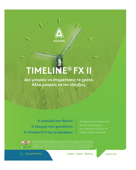 Η ADAMA έχει ενισχύσει το χαρτοφυλάκιό της µε το κορυφαίο και καινοτόµο µεταφυτρωτικό ζιζανιοκτόνο σιτηρών TIMELINE FX II. Το προϊόν αποτελείται από ένα ισχυρό µείγµα τριών δραστικών ουσιών µε διαφορετικούς και συµπληρωµατικούς τρόπους δράσης, εξασφαλίζοντας την αποτελεσµατική καταπολέµηση ετήσιων και πολυετών ζιζανίων, αγρωστωδών και πλατύφυλλων,