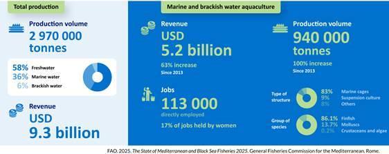 Ομοίως, μόνο οκτώ χώρες παράγουν το 95,5 τοις εκατό των καλλιεργούμενων τροφίμων υδρόβιας προέλευσης της περιοχής, με επικεφαλής την Τουρκία (400.000 τόνοι), την Αίγυπτο (147.000 τόνοι) και την Ελλάδα (139.00 τόνοι). Ως αποτέλεσμα, η υδατοκαλλιέργεια έχει γίνει η πιο ραγδαία αναπτυσσόμενη πηγή τροφίμων υδρόβιας προέλευσης της περιοχής και ένας αναπτυσσόμενος πυλώνας επισιτιστικής ασφάλειας και βιοποριστικών μέσων στις παράκτιες ζώνες.