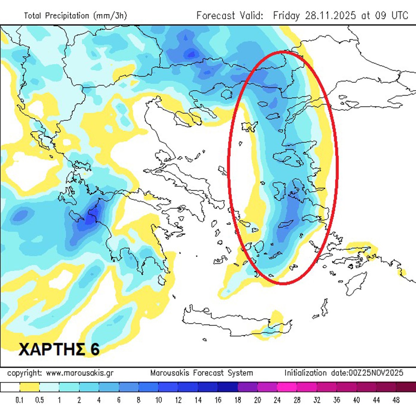 Την Παρασκευή (28/11) ισχυρές βροχές και καταιγίδες προβλέπονται σε κεντρική και ανατολική Μακεδονία, Θράκη, ανατολικό Αιγαίο και μέχρι νωρίς το πρωί στη δυτική Ελλάδα.