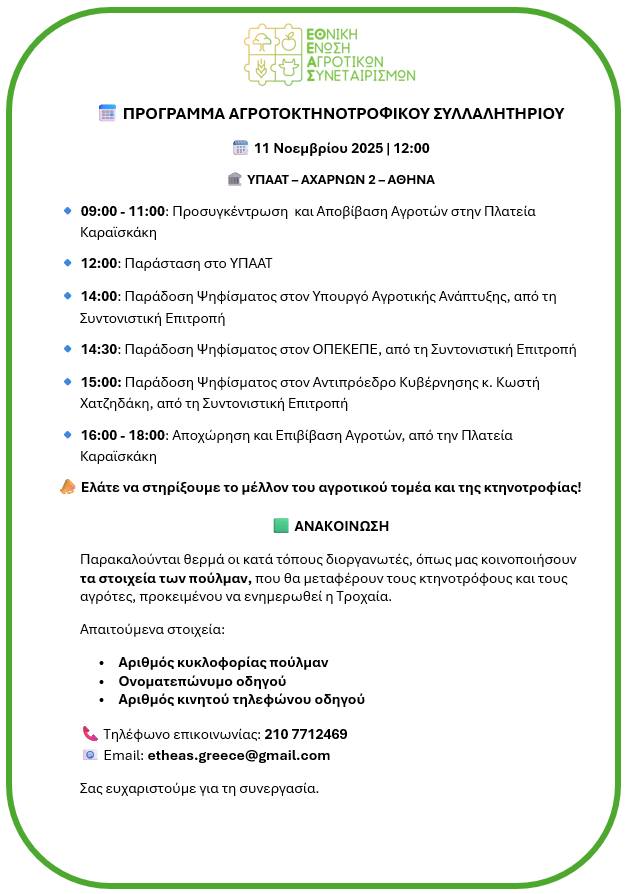 Για την ώρα, αντίστροφα µετράει ο χρόνος για το ραντεβού που έχουν δώσει στην Αθήνα στις 11 Νοεµβρίου αγρότες και κτηνοτρόφοι υπό την οργανωτική οµπρέλα της ΕΘΕΑΣ. Η διαµαρτυρία έχει προγραµµατιστεί στις 12:00, στο Υπουργείο Αγροτικής Ανάπτυξης, µε τη συµµετοχή αγροτικών συνεταιρισµών, αγροτικών συλλόγων, οµοσπονδιών, παραγωγών και κτηνοτρόφων από όλη τη χώρα.