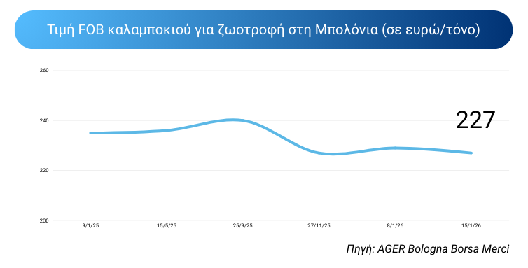 Άλλη σημαντική εμπορική αγορά για τη Μεσόγειο είναι η Μπολόνια. Σύμφωνα με το τελευταίο κλείσιμο του τοπικού χρηματιστηρίου εμπορευμάτων, η τιμή του καλαμποκιού για ζωοτροφή είναι στα 229 ευρώ/τόνο (15 Ιανουαρίου 2026), ενώ πέρυσι ήταν στα 235 ευρώ/τόνο (9 Ιανουαρίου 2025). Δηλαδή μία μικρή μείωση της τάξης του 2,6%.