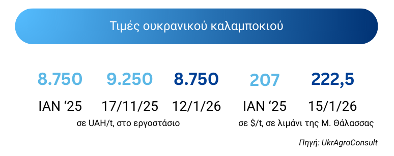 Μένοντας στις φυσικές αγορές, η πιο σημαντική για το ελληνικό καλαμπόκι είναι η ουκρανική παραγωγή. Η τελευταία τιμή παραγωγού (12 Ιανουαρίου), σύμφωνα με το UkrAgroConsult, είναι στα 8.750 UAH/τόνο, ακριβώς στο ίδιο επίπεδο με την τιμή του Ιανουαρίου του 2025. Αντιθέτως, υπάρχει σημαντική αύξηση στις τιμές επί πλοίω με αναχώρηση από λιμάνια της Μαύρης Θάλασσας, λόγω της αύξησης του κόστους της μεταφοράς: 222,5 ευρώ/τόνο στις 15 Ιανουαρίου 2026, έναντι 207 ευρώ/τόνο τον Ιανουάριο του 2025.