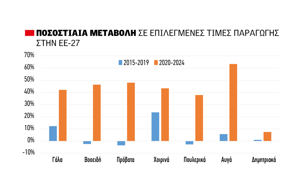 ∆υναµική τιµών και κόστους: Οι τιµές των γεωργικών εισροών αυξήθηκαν απότοµα µετά το 2021, δηµιουργώντας µια αρχική συµπίεση στα περιθώρια κέρδους των γεωργικών εκµεταλλεύσεων. Οι τιµές των προϊόντων αυξήθηκαν αργότερα σε πολλούς τοµείς, αλλά αυτές οι αυξήσεις τιµών δεν ήταν οµοιόµορφες ως προς το χρονισµό ή το µέγεθος. Το 2023 οι τιµές παραγωγής µειώθηκαν σε ορισµένους τοµείς, ενώ το κόστος των εισροών παρέµεινε υψηλό, οδηγώντας σε σηµαντική µείωση του εισοδήµατος σε ορισµένους τοµείς της γεωργίας.