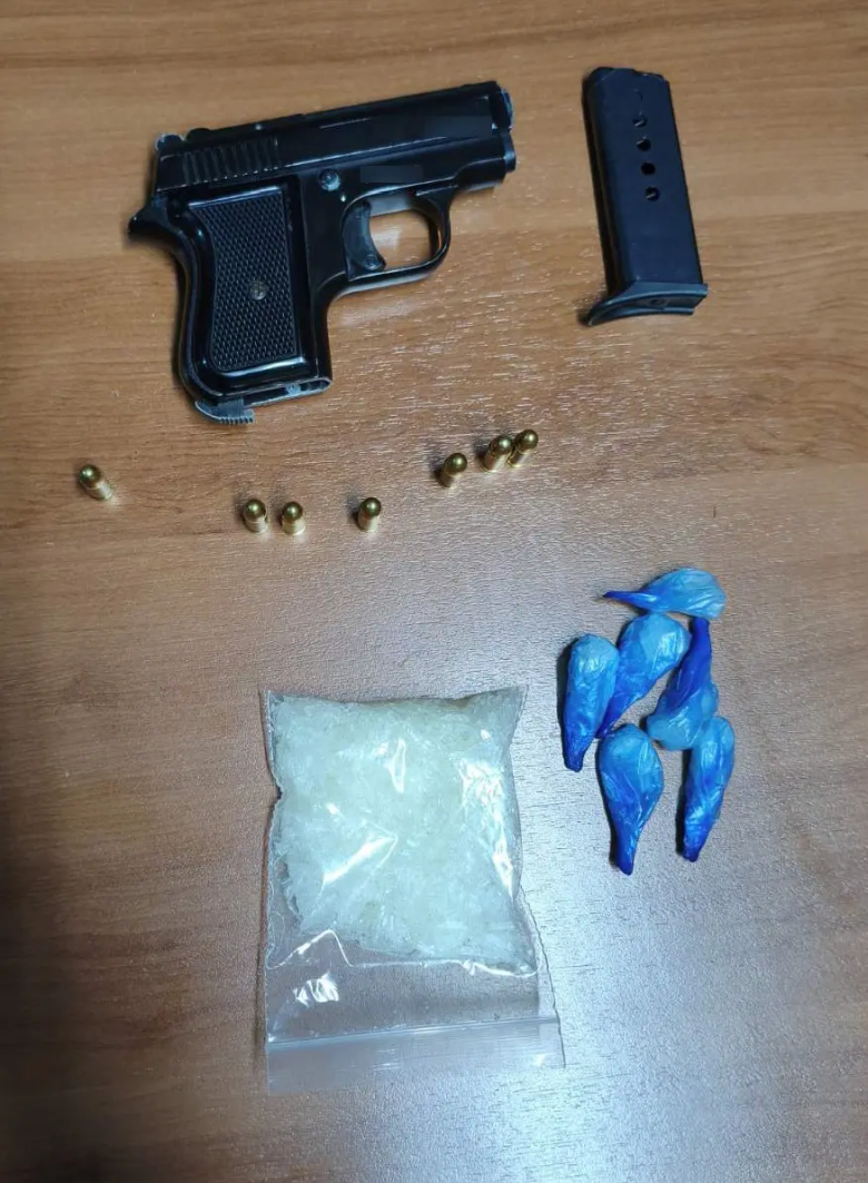 Μετά από έρευνα στο σπίτι του, αρχικά βρέθηκαν και κατασχέθηκαν το επίμαχο πυροβόλο όπλο τύπου (pocket), γεμιστήρας με 7 φυσίγγια και 7 νάιλον συσκευασίες περιέχουσες 36,3 γραμμ. κρυσταλλικής μεθαμφεταμίνης, ενώ σε έρευνα από αστυνομικούς του τμήματος Δίωξης και Εξιχνίασης Εγκλημάτων Αγίου Παντελεήμονα και της Ομάδας ΔΙΑΣ, σε αποθήκη ιδιοκτησίας του 35χρονου, βρέθηκαν επιπλέον και κατασχέθηκαν: